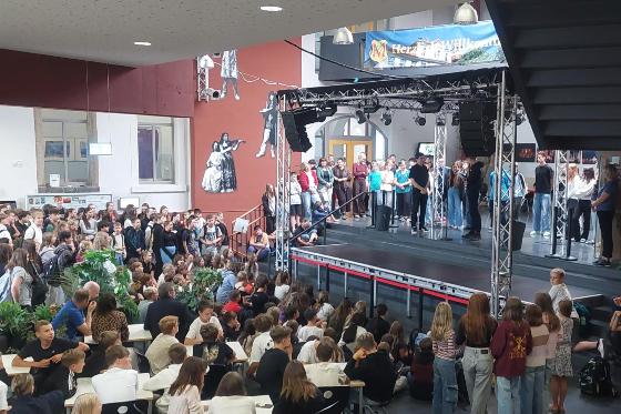 Eine wunderbare Überraschung bereiteten Schülerinnen und Schüler dem Schulleiter Heiko Vogel zum Geburtstag: Gemeinsam wurde im Foyer ein Ständchen gesungen.