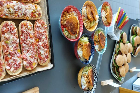 Neben dem warmen Angebot an Käsebrötchen und Laugenstangen, gehören auch Zimtschnecken, Müsliriegel und Muffins zum täglichen Angebot in der Frühstückspause, die nach kurzer Zeit ausverkauft sind. Zweimal die Woche gibt es daher auch mittags eine gesunde Alternative. Nach anfänglicher Skepsis werden nun auch Veggi-Burger und Bowls von immer