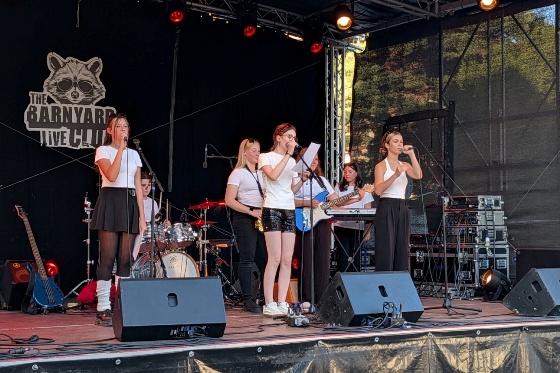Gleich zwei Bands spielten in diesem Jahr auf der großen Bühne des Hoftheaters zum Weinfest. Die Black Ladys aus Klasse 8 und die Multitasken aus Klasse 9 präsentierten ihre aktuellen Coversongs. Nachdem sich die Aufregung etwas gelegt hatte, lieferten sie gut ab und boten dem Publikum eine gute musikalische Show.