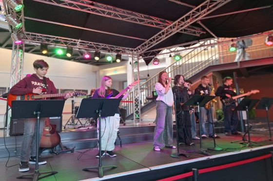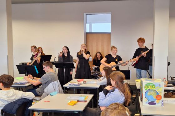 Das Projekt "Workshop Band und Songwriting" bietet in der fächerverbindenden Woche Gelegenheit, die Projektpausen musikalisch zu bereichern. Vor allem unsere noch jungen Musiker der 7. Klassen schnubbern somit vor dem traditionellen "Rock im Foyer" zum ersten Mal richtige Bühnenluft und erleben Aufregung, Lampenfieber und begeisterten Applaus. Gleichzeitig entstehen in der gemeinsamen kreativen Zeit eigene Rocksongs, auf deren Weltpremiere sich unsere beiden Bands am Tag der Projektpräsentationen schon riesig freuen.