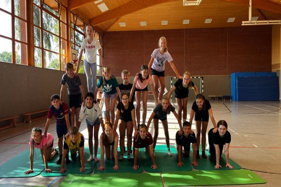 Unsere Turnhalle verwandelte sich in dieser Woche in eine Bühne der besonderen Art: Wo sonst Bälle rollen und Reifen klappern, formten sich plötzlich kunstvolle Figuren aus Menschen – die Gauklergruppe probte ihre Pyramiden. Schritt für Schritt wuchsen die Gebilde aus gestreckten Armen, festen Schultern und Vertrauen empor, bis schließlich mehrere Ebenen in luftiger Höhe balancierten.