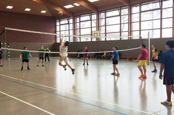 Die 5. und 6. Klassen maßen ihre Kräfte im Powerball. Dieses Spiel ist die Vorstufe zum Erlernen des Volleyballspieles. Der Ball muss mit oberem oder unterem Zuspiel über das Netze gespielt werden. Dabei darf er aber noch den Boden berühren. Die Jungen der 6b hatten dabei etwas die Nase vorn.