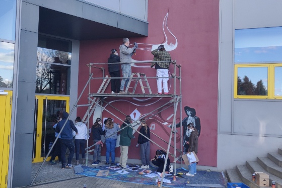 Im Rahmen unseres fächerverbindenden Unterrichts gestalteten 9 Schülerinnen der 8. Klassen eine Wand in unserem Eingangsbereich. Unter Anleitung des Großenhainer Künstlers Sebastian Bieler sprühten sie Motive, die das Lernen an unserer Schule symbolisieren. Konstant im Stil wuchs so die Gestaltung unseres Schulhauses ein weiteres Mal.