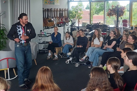 Nuvassie Blacksmith vom indigenen Volk der Lakota war zu einer interkulturellen Kennenlernrunde im Rahmen des Englisch-Unterrichtes in Klasse 8 bei uns zu Gast. Nach einer kurzen Vorstellung sprudelten die Fragen auf Nuvassie ein, die er nahe bei seinen Zuhörern beantwortete. Ein besonders berührender Moment war, als der Gast eine Frage nach dem Häuptling der Lakota emotional höchst berührt mit einer Hoffnung in die Zukunft beantwortete.