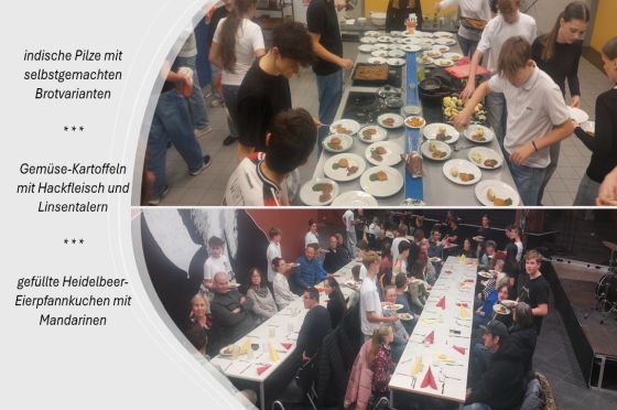 Tische stellen und perfekt eindecken, Teige kneten, Pilze schneiden, Kartoffeln kochen, Linsentaler herstellen, Hackfleisch braten und Salate zubereiten – viel war für die 20 Schüler und Schülerinnen der 8. Klassen am Donnerstagnachmittag zu tun. Innerhalb zwei Stunden sollte ein abwechslungsreiches 3-Gang-Menü im Rahmen des WTH-Unterrichts fertiggestellt sein. Stressig war es bis zum Schluss auf jeden Fall, aber die über 40 eingeladenen Gäste konnten pünktlich den Abend beginnen und sich für eine Stunde einfach mal entspannen und genießen. Den Applaus am Ende hatten sich die Schüler wirklich verdient!
