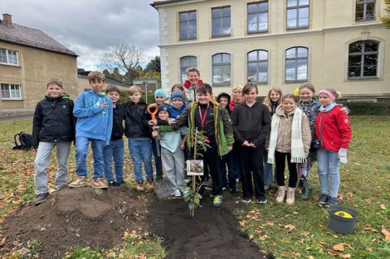 Die Klasse 5c pflanzte wie schon einige Klassen vor ihnen ihren Klassenbaum. Der kleine Kirschbaum fand am 24. Oktober 2025 seinen Platz vor der Schule.