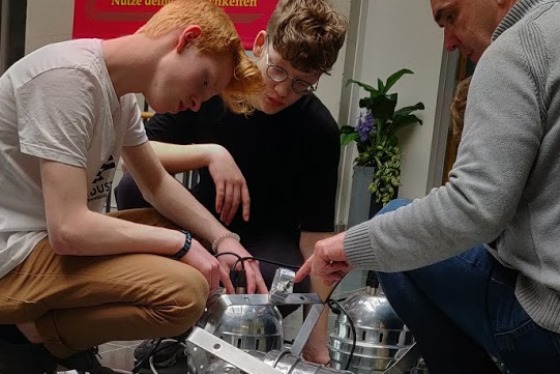 Im Bild experimentieren Schüler mit ihrem Lehrer mit der Steuerung der Lichttechnik zur Vorbereitung auf den Schul-Showtanzwettbewerb "Schule-Tanzt".