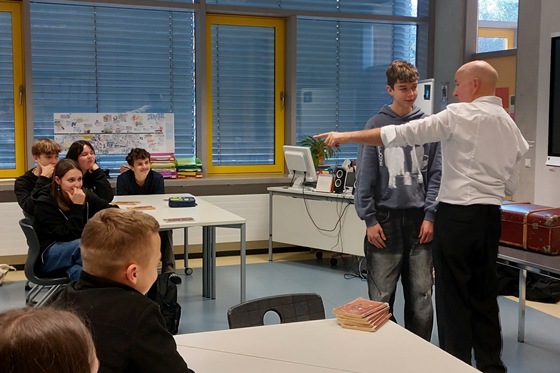 impulsiv, mitreißend und sehr aktiv erlebten die Schülerinnen und Schüler die prüfungsrelevante Literatur "Faust". Zu Beginn war die Skepsis der Klasse 10b deutlich in den Gesichtern erkennbar. Wie soll nur ein Schauspieler dieses alte und komplizierte Theaterstück präsentieren? Aber bereits nach wenigen Minuten folgten alle aufmerksam und interessiert der perfekten Vorführung. Zeile um Zeile des Stückes wurden schauspielerisch und informativ im Klassenzimmer mit wenigen Requisiten vorgeführt. Absolutes Highlight war die ständige Einbindung der einzelnen Schüler als literarische Figuren Wagner, Marthe, Hexe, Valentin sowie Gretchen, aber auch die musikalische Umsetzung der Szene Walpurgisnacht in der Gesamtgruppe führte bei vielen noch zu Gesprächsthemen auf dem Weg nach Hause. So bleibt die Prüfungsliteratur sicher noch lange in Erinnerung.